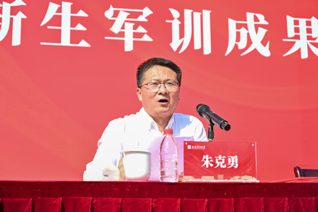 朱克勇宣读《关于表彰2025级学生军训工作先进集体及先进个人的决定》,激励全体新生以榜样为镜,勇毅前行。