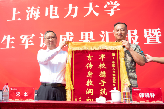 宋来向承训部队赠送锦旗,向全力支持我校军训的部队全体带训官兵致以诚挚感谢与崇高敬意。