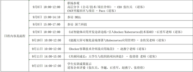 经计算机学院与道客网络科技公司的多轮协商与精心设计,确定了本次夏令营的主旋律为“企业参访—企业导师线下讲解+任务驱动学生自主探索—学生汇报展示”。学生参访了云原生领域的创新领导者上海道客(DaoCloud)网络科技有限公司、世界500强企业戴尔(DELL)股份有限公司、人工智能领域领军企业深兰人工智能科技(上海)股份有限公司,学习了云原生的核心技术Docker/Kubernets,并以小组形式完成了“能源大屏可视化前端部署”、“AI智能体应用开发”项目的设计、开发与部署。道客公司首席执行官张红兵、开源总负责人徐俊杰Paco、技术总监李越、技术专家石勇军、技术专家金传昊、技术专家赵燕宁、人力资源总监张倩倩参与分享与授课,并参加学生汇报答辩评审。同学们答辩表现优秀,现场收到企业的实习邀请。