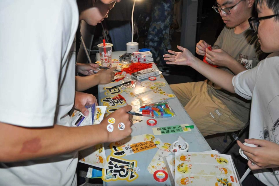 由学校精心打造的 “月下非遗市集”,成为新生感受传统文化与校园特色交融的绝佳去处。市集里,一面面精美的扇面将书画艺术与传统美学完美结合,新生们驻足欣赏,不时与创作者交流心得;扎染体验区前更是人头攒动,在非遗老师的耐心指导下,新生们亲手将白布折叠、捆扎,再浸入调配好的染料中,亲眼见证布料在染色过程中 “千变万化” 的奇妙效果。不少新生将亲手制作的扇面、扎染作品珍藏起来,当作融入校园文化的第一份 “专属纪念”。