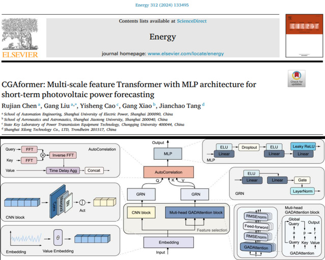 在《Energy》上发表的论文“CGAformer: Multi-scale feature Transformer with MLP architecture for short-term photovoltaic power forecasting”(DOI: 10.1016/j.energy.2024.133495),针对光伏发电的强波动性、高间歇性及明显周期性特点,提出了基于一维卷积神经网络、全局累加注意力和自相关的混合模型 CGAformer,用于短期光伏功率预测,实现了多尺度特征的高效捕获。