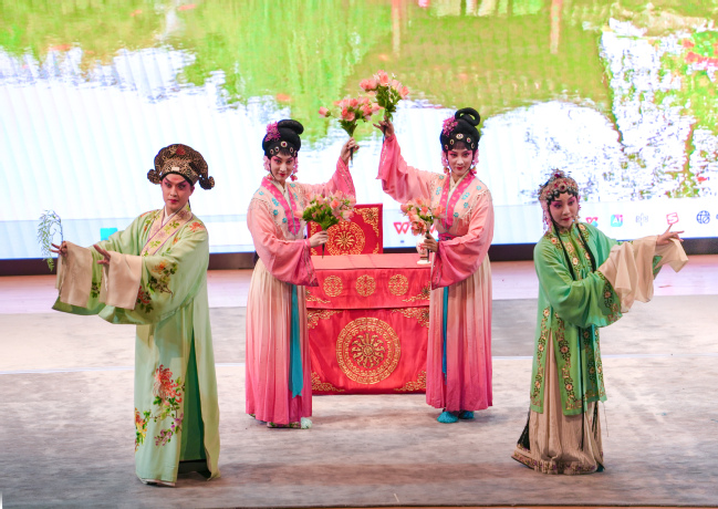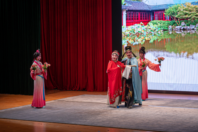 演出精选《牡丹亭》中《游园·惊梦》《寻梦》《回生》等核心选段,以细腻生动的表演,将杜丽娘与柳梦梅的爱情故事演绎得委婉动人。舞台上,演员以水袖为笔、唱腔为弦,一颦一笑尽显昆曲之雅,一唱一叹皆诉人间至情。笛、箫、笙等传统乐音与婉转“水磨调”相映生辉,将昆曲“声中无字,字中有声”的韵律之美烘托得淋漓尽致,引得现场观众沉醉其中,掌声不断。
