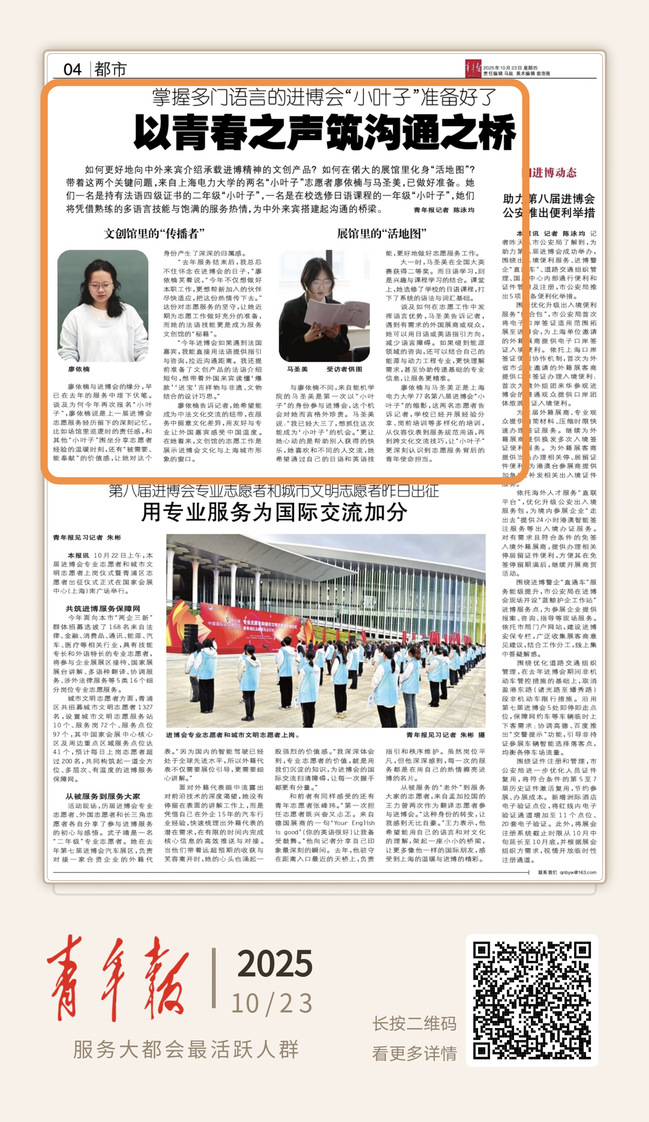 10月23日出版的《青年报》第四版,头条报道我校即将上岗的进博会志愿者风采。文章以《以青春之声筑沟通之桥》为题,讲述了人工智能学部学生廖依楠与能源与机械工程学院学生马圣美用心用情做好志愿服务准备的故事。《青春上海》客户端于10月22日也全文发布。