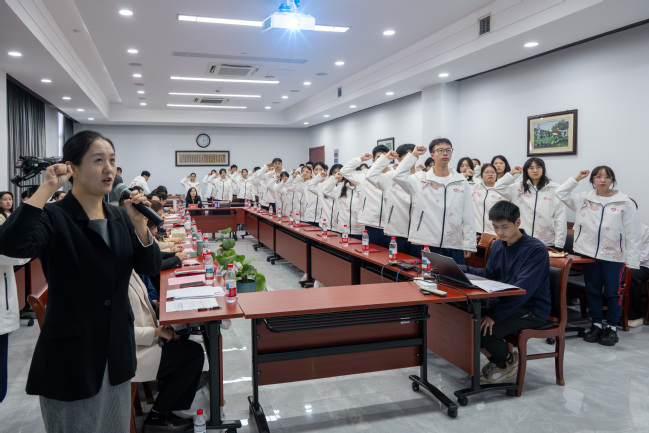全体志愿者在原电气工程学院团委书记、第八届进博会志愿者带队老师刘紫薇的带领下庄严宣誓,“奉献友爱,互助进步!追求卓越,全力以赴!为祖国增光,为城市添彩!为taptap体育勇争佳绩!为进博,一起来!向前进,博青春!”。