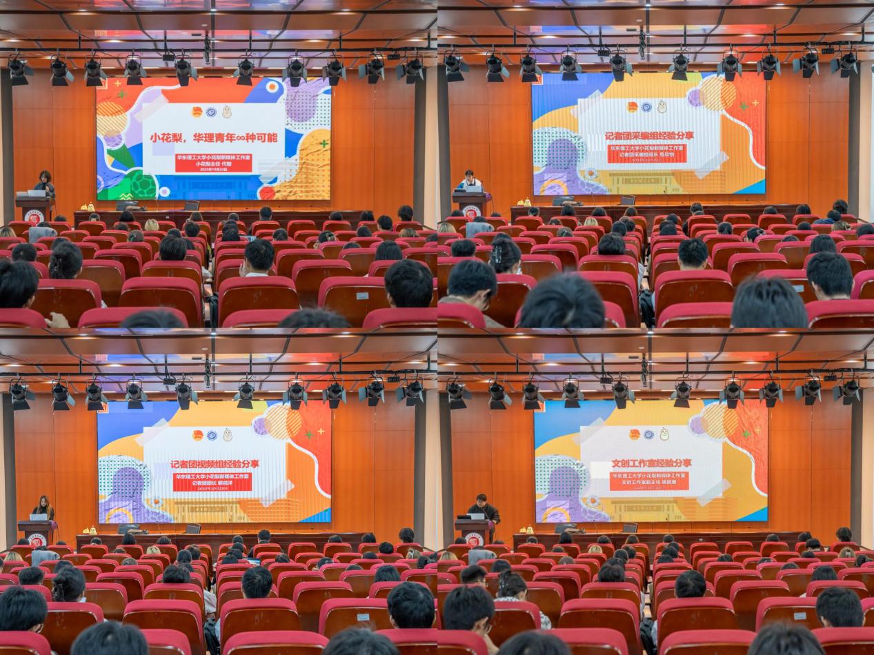 在校际交流环节,华东理工大学“小花梨新媒体工作室”团队分享了其新媒体运营的先进经验。工作室主任代璇围绕“队伍建设与核心发力”主题,系统介绍了团队工作模式、选题例会制度及“中央厨房”内容生产机制,强调以青年话语体系传递正能量。记者团采编组组长包欣怡聚焦内容形式创新,深入解析了SVG交互动画的设计与应用,提出通过创意转化打造青年喜闻乐见的推送内容。记者团团长解成洋从选题策划、分镜设计到拍摄剪辑,系统梳理了视频生产的标准化流程,强调以规范支撑创意,做有温度的校园记录者。文创工作室副主任姚懿展则介绍了“小花梨”品牌形象的衍生体系与文创产品设计思路,并分享了灵活高效的任务与激励机制,以视觉设计持续丰富品牌内涵。