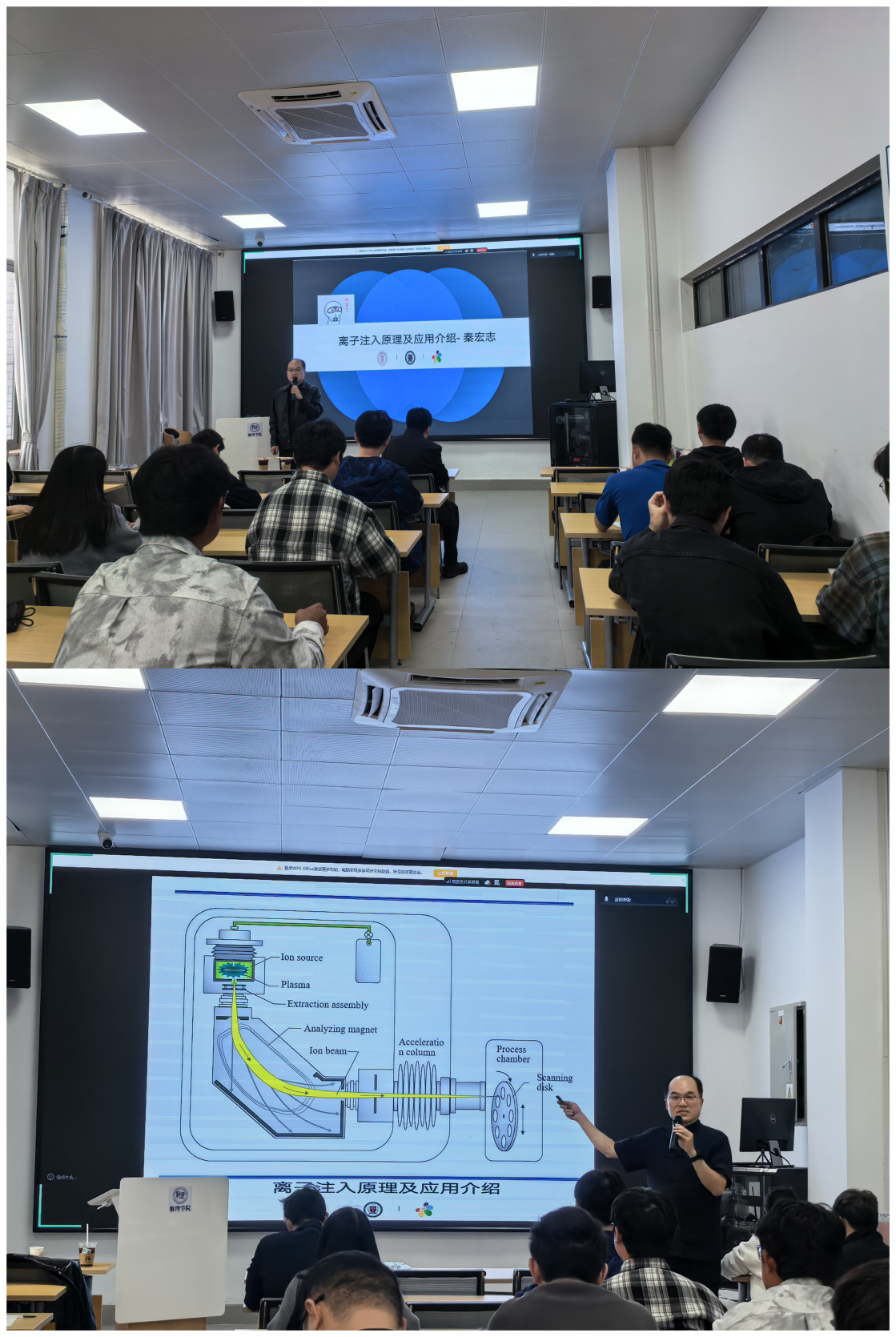 为深化半导体领域产教融合,助力微专业人才培养与技术创新,11月1日下午,我校特邀半导体行业资深专家、浙江创芯集成电路有限公司运营副总裁秦宏志主讲,为师生带来一堂主题为 “离子注入设备” 的课程。秦宏志凭借深厚的学术积淀与丰富的产业经验,系统解析离子注入技术的核心原理、设备构造及行业应用,为在场师生奉上了一场兼具理论深度与实践价值的知识盛宴。课程面向我校微专业学生、DBU大学研究生以及对此课程有浓厚兴趣的学生,通过线下与线上同步授课的形式,吸引了百余人的参与。课程由数理学院副院长(主持工作)林佳主持。
