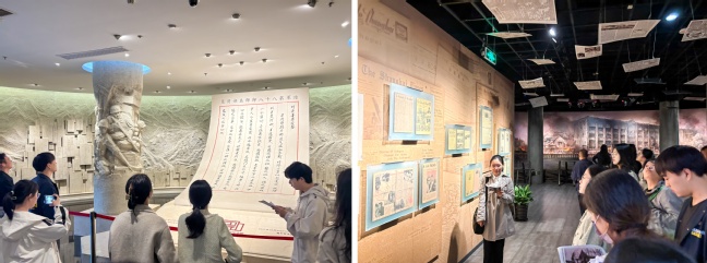 为让历史场景鲜活再现,学生党员和入党积极分子提前学习,在研学过程中,同学们以讲解的方式,将历史讲述与角色扮演深度融合,带领大家重回1937年那片硝烟弥漫的战场。进入场馆内,在面向谢晋元将军的家书时,学生陈士博动情介绍道,“这是他留给妻子的诀别信,更是留给民族的精神誓言。”这份巨幅家书背后,是战士们的一封封家书、遗书共同组成的一道爱国主义的精神长城,与背景中祖国山河的影像交叠,让在场的师生深切感受到舍小家为大国的家国情怀。在西墙前,学生刘思琪介绍了“八百壮士”孤军据守四行仓库、四昼夜十余次击退日军进攻的英勇事迹,斑驳弹孔墙默默伫立,宛如诉说着那场血与火的抗争。