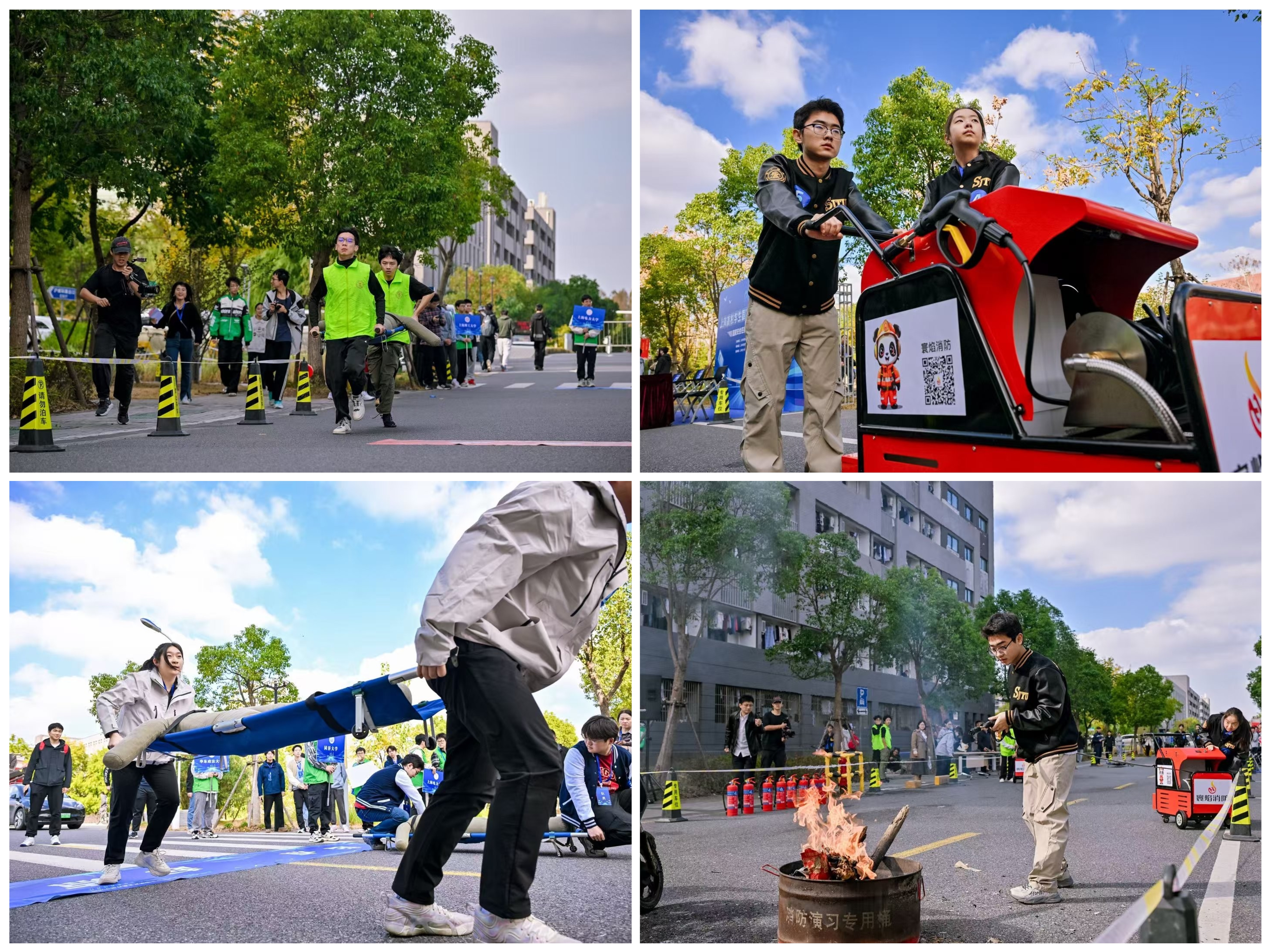 展示活动分为技能操作和理论竞答两大环节。技能操作环节,将大学生安全教育与现实场景深度融合,通过参赛队伍同台比拼“固守待援”“云梯逃生”“担架转运”和“电动自行车火灾扑救”等实战项目,在默契协作中展现应急处置硬实力,全面检验同学们应对突发事件的应急处置能力与自救互救素养。