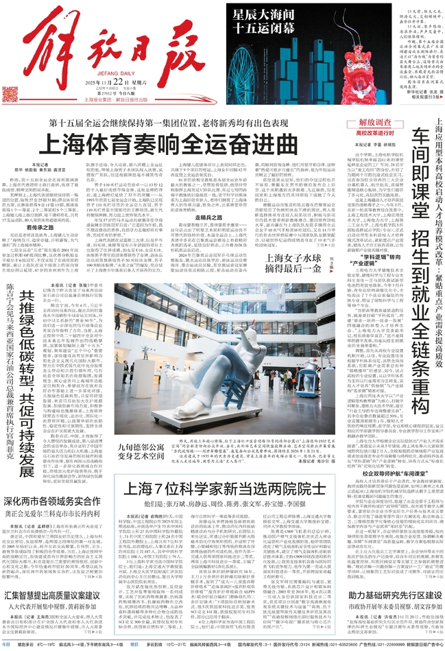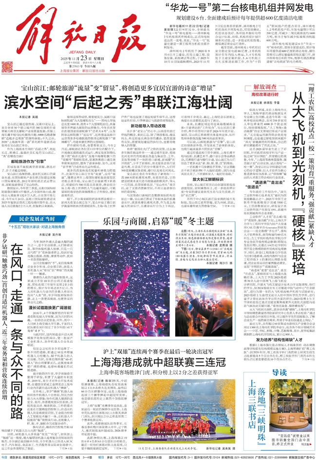 11月22日至23日,《解放日报》在头版连续推出《高校改革进行时》专栏,持续报道了我校等高校聚焦国家战略与经济社会发展需求,积极探索全链条重构新型人才培养生态、推动教育链与产业链无缝对接的实践举措与初步成效。