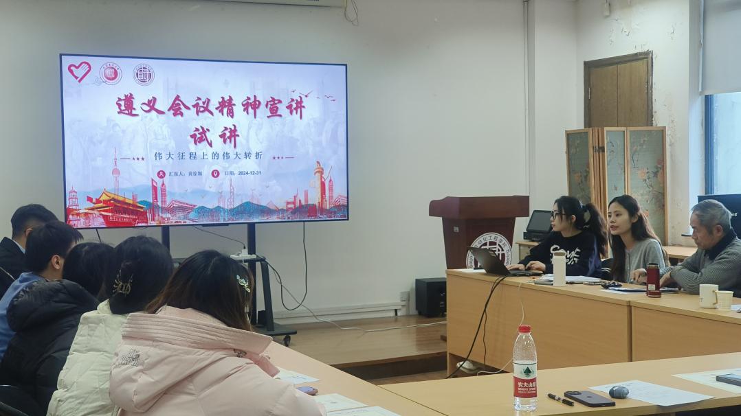 团长黄徐颖则围绕遵义会议精神进行宣讲试讲,她以爱国动漫《那年那兔那些事儿》中遵义会议视频片段为引入,结合动画故事,围绕遵义会议的历史背景、发展过程、精神内涵及其当代价值进行宣讲,号召同学们弘扬“坚定信念、实事求是、独立自主、敢闯新路、民主团结”的遵义会议精神,走好新时代长征路,让遵义会议精神永放光芒。此外,黄徐颖围绕此次遵义会议精神宣讲,对宣讲方案及成员分工做好安排。