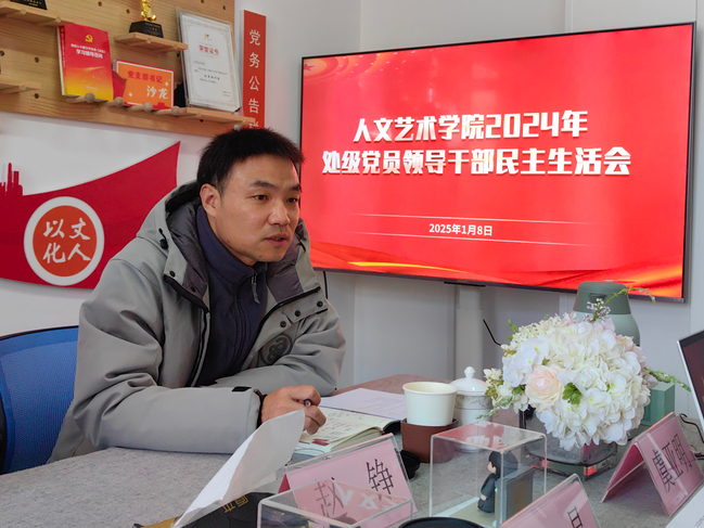 2025年1月8日上午,人文艺术学院在临港校区数理楼B211会议室召开2024年处级党员领导干部民主生活会。校党委副书记仰颐莅临指导,校融媒体中心主任兼宣传部副部长赵铮、校党委宣传部孟繁晨作为督导组列席指导。人文艺术学院处级党员领导干部、党总支委员、专职组织员出席会议。会议由人文艺术学院党总支书记周洁明主持。