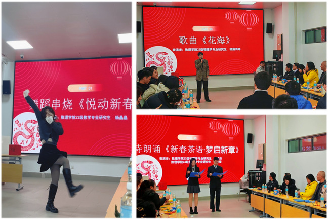 2023级数学专业研究生杨晶晶带来的舞蹈串烧《悦动新春》为本次活动拉开了序幕。随后,学院党委副书记赵月琴致辞,她希望同学们在复盘2024年学习生活的同时,欢度假期休息调整劳逸结合,提醒留校学生注意防火、防诈、交通等各项安全,并向全体师生送上新春祝福。