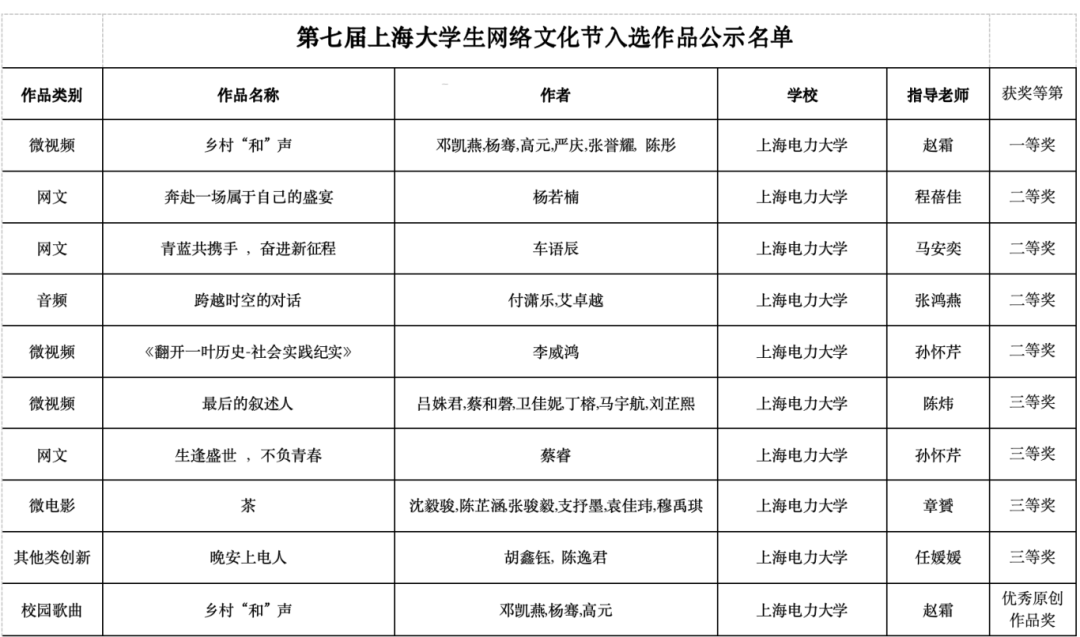 大学生网络文化节和高校网络教育优秀作品推选展示活动旨在鼓励和引导广大师生积极参与网络文化作品创作,创作优质、主流的网络文化作品,发挥网络育人的作用。作为上海高校网络思政领域的最高赛事之一,第七届上海高校网络文化节自2023年12月开展,学校认真组织筹备,得到了师生的积极响应和热情参与,我校共选送微视频、微课、音频、网文、新媒体作品等各类别百余件作品参赛。最终共有13项作品获奖,共获一等奖2项,二等奖4项,三等奖6项,优秀原创作品奖1项。