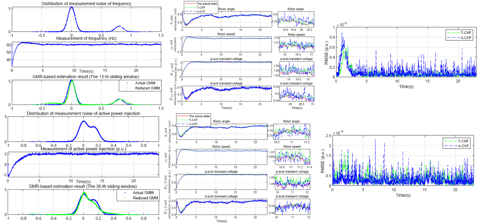 针对上述问题,本文提出一种自适应动态状态估计算法,利用滑动窗口数据和高斯混合模型等技术,有效解决了多机电力系统在未知统计测量噪声下的状态估计问题。具体地,在同步发电机建模方面,采用模型解耦技术实现了发电机与整个电网的解耦,为算法的分布式部署奠定了基础。在未知测量噪声统计学特性的刻画方面,利用滑动窗口内的连续测量值及核密度估计方法构建了基础高斯混合模型,随后采用Wasserstein距离准则驱动的模糊聚类算法进一步减少了基础高斯混合模型的元素数量,有效降低了模型复杂度。基于上述模型,进一步在容积卡尔曼滤波算法的框架下设计了状态估计算法,实现了对噪声统计特性的自适应。基于IEEE 39节点系统的测试结果表明所提算法不仅能够准确揭示测量噪声的统计学分布,同时也能够准确估计同步发电机的状态。