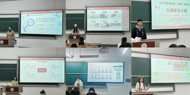 在科创实践方面,服务站党员徐嘉怡针对大一同学们做科创科普,介绍我校的创新创业实践活动类型、实践学分等;党员陈豪、袁晴分享她们参加知行杯暑期社会实践的经历和备赛体验,动员同学们将论文写在祖国的大地上,用汗水书写青春篇章。党员吴继慧、田留洋同志分享自己作为进博会志愿者的感悟和收获,号召同学们在志愿活动中丰富自身的实践经验,培养社会责任感。