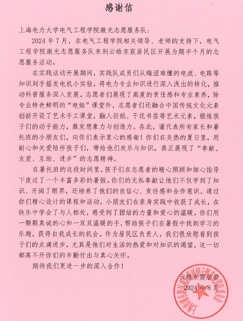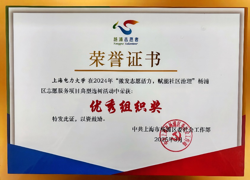 近日,在杨浦区2024年度“激发志愿活力,赋能社区治理”志愿服务项目典型选树活动中,我校获评“优秀组织奖”;我校电气工程学院刘紫薇老师指导的“‘电’亮科学梦,科普进社区”志愿服务项目从83个参选项目中脱颖而出,荣获优秀项目二等奖并入选2024年度杨浦区“激发志愿活力,赋能社区治理”志愿服务项目典型选树案例集。