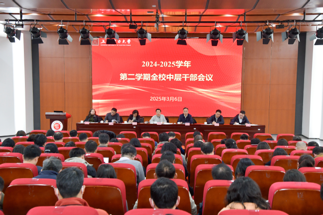 3月6日下午,2024-2025学年第二学期全校中层干部会议在临港校区学术楼103报告厅举行。校党政领导李明福、顾春华、张艳林、朱克勇、符杨、张波、张川出席,全体中层干部与会,李明福主持会议并讲话。