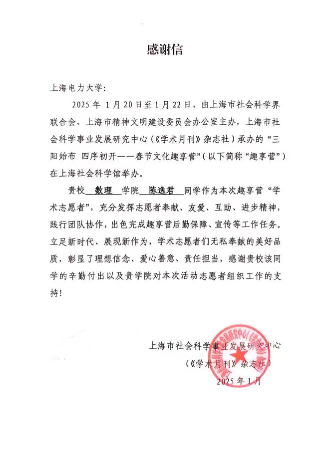 同时数理学院学生在学习和践行雷锋精神方面取得了显著成果。2021级应用物理学专业陈逸君同学在2025年1月20日至22日,作为学术志愿者,参加由上海市社会科学界联合会主办的“三阳始布 四序初开——春节文化趣享营”活动,积极参与后勤保障和宣传工作,展现了无私奉献的志愿精神。对此,上海市社会科学事业发展研究中心特发感谢信,对陈逸君同学的辛勤付出和学院的支持表示诚挚感谢,称赞她彰显了理想信念和责任担当,认为她的表现值得全体同学学习。