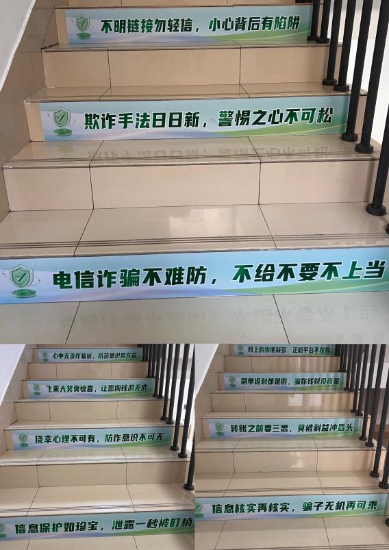 环化学院积极营造浓厚的反诈宣传氛围,力求做到“抬头可见、驻足即学”。在学院楼门前的主干道上,悬挂着醒目的反诈标语横幅,“未知链接不点击、陌生来电不轻信、个人信息不透露、转账汇款多核实” 等朗朗上口的提示语,时刻提醒着过往学生提高警惕。同时,学院创新性地在楼内楼梯台阶张贴 “防诈阶梯”警示地贴,诸如“信息核实再核实,骗子无机再可乘”“侥幸心理不可有,防诈意识不可无” 等标语,让学生在日常行走间潜移默化地接受反诈教育。此外,学院充分利用新媒体平台的传播优势,在微信公众号上连续推出《诈骗套路多 防诈有妙招》专题内容,各班级群也定期转发警方发布的预警信息,确保反诈宣传全方位、无死角,真正深入到学生的学习与生活之中。