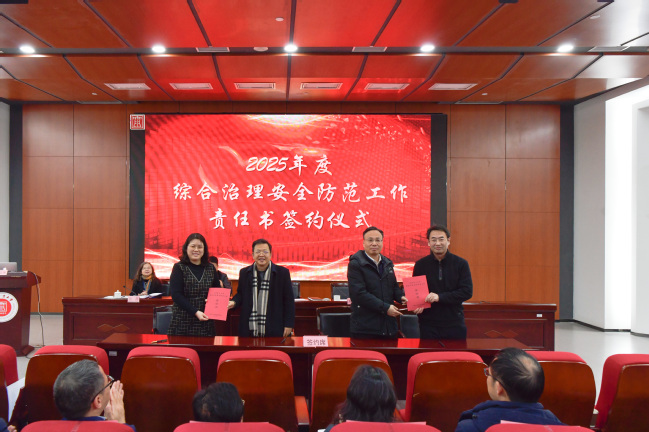 会上还进行2025年度综合治理安全工作责任书签约仪式,职能部门和二级学院党政负责人代表与校领导签订安全工作责任书。