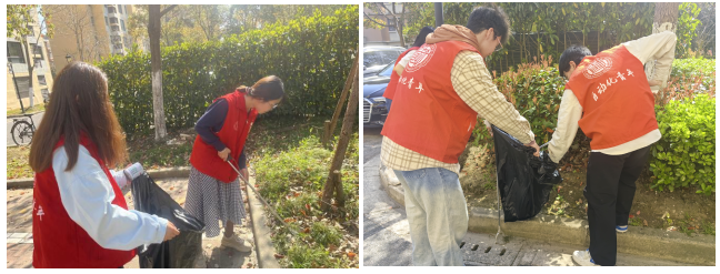 20名志愿者身着学院统一红色志愿马甲,经辖区划分和任务分配后,联合社区志愿者领取清扫工具,清扫枯枝落叶、拾捡烟头塑料等,随后进行分类打包处理。大家配合默契、干劲十足,为维护社区的洁、净、美贡献力量。